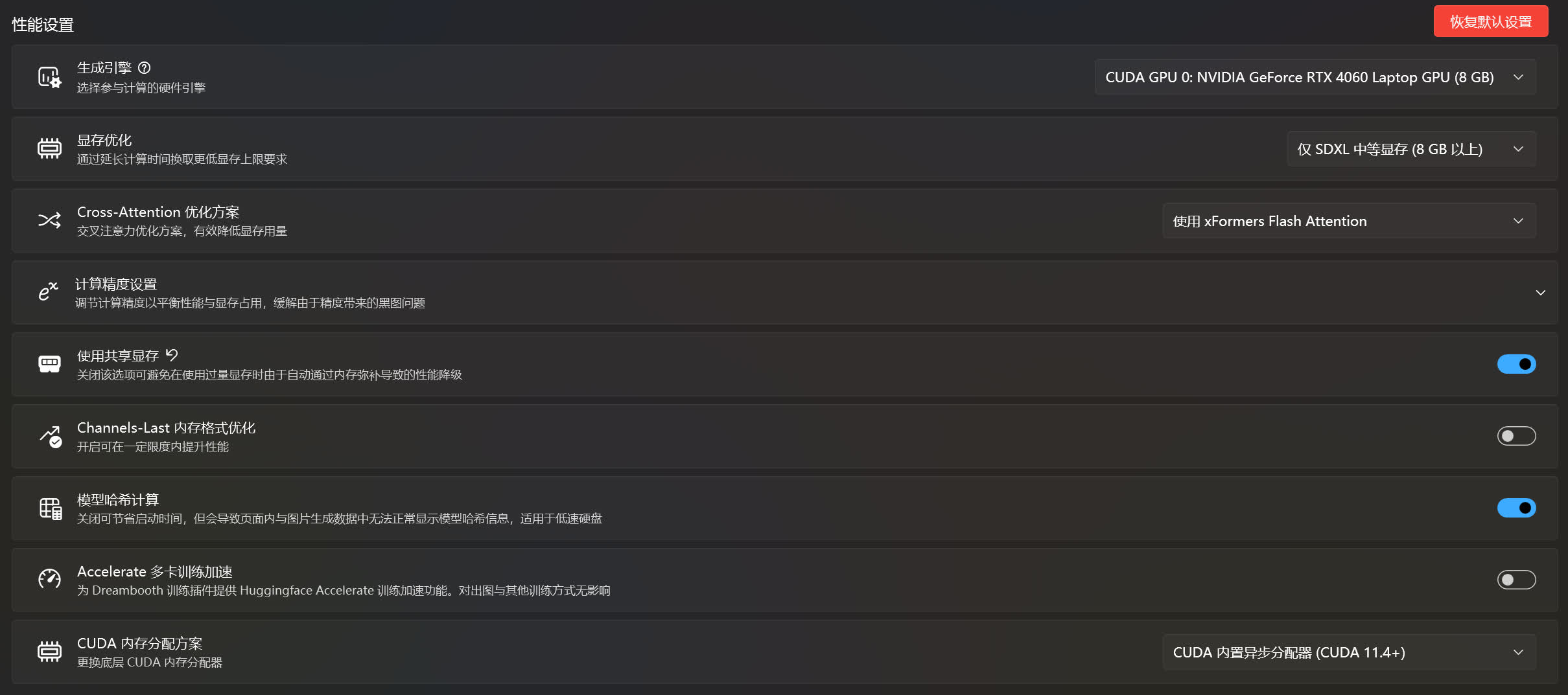 比如显卡的显存为 8 GB,这时候就要选择对应的仅 SDXL 中等显存 (8 GB 以上)选项,或者比这个选项更低的选项,不然容易出现爆显存的问题。