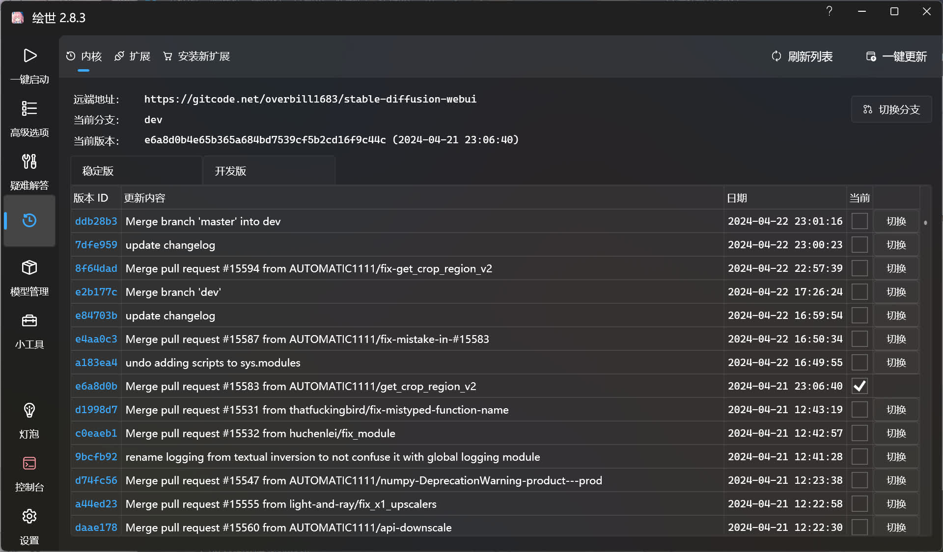 切换 SD WebUI 的分支,可以将 SD WebUI 的分支在 AUTOMATIC1111/stable-diffusion-webui、lshqqytiger/stable-diffusion-webui-directml 、vladmandic/automatic 之间进行切换。